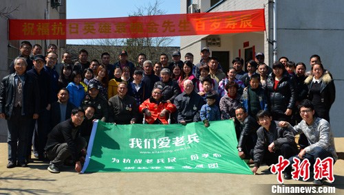 3月15日,浙江志愿者为该省绍兴诸暨百岁老兵袁槐金过生日,志愿者与老人合影留念。据悉,当天有来自浙江多地的志愿者约50余人,为老人带来了慰问金、蛋糕、鲜花、唐装等,老人感到非常开心。袁槐金曾于1938年从军卫国,在战场上九死一生,奉献青春。中新社发 何成永 摄