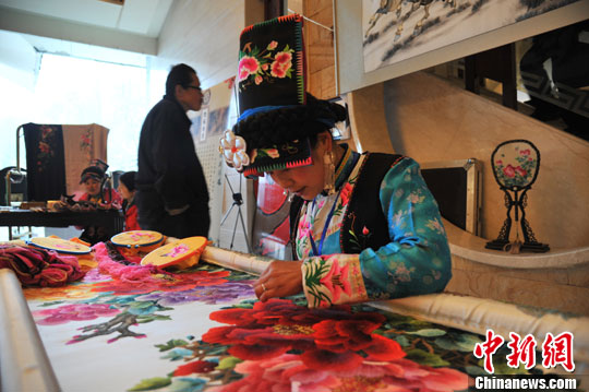 3月22日,四川北川举行非物质文化遗产进景区活动,多项非遗项目在药王谷景区展演。图为四川省省级非物质文化遗产遗产项目《羌绣》展示。中新社发 杨勇 摄