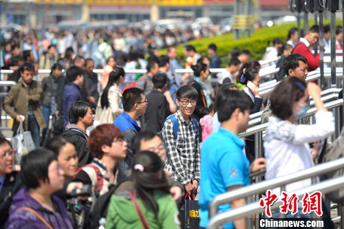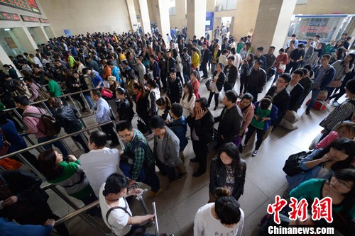 44月7日,山西太原火车站,民众准备乘车返程。当日是2014年中国清明小长假的最后一天,各地车站纷纷迎来返程客流高峰。中新社发 韦亮 摄