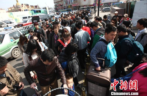 4月7日下午,青岛火车站,候车客外人流涌动。探亲流,旅游流,二流合一,铁路进入返程客流高峰。预计一天发送乘客4.5万人次,创历年清明节小长假客流量新高。中新社发 徐崇德 摄