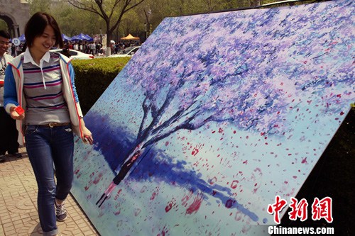 4月7日,天津大学北洋广场一角,一位女大学生正要往画作上摁手印,为“海棠花”画作添彩。 当日,天津大学举行校园开放日,为学生和家长提供高考招生咨询,邀请市民入校欣赏海棠绽放的盛景,并通过开放实验室、中国传统文化游园会等互动节目将天大的科研教学实力和丰富的校园生活展示给咨询学生及游览的市民。中新社发 张道正 摄