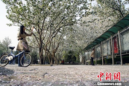 4月7日,南开大学敬业广场附近的海棠花开灿烂如画,不少学子驻足流连于此,纷纷拿相机留影,定格青春瞬间。中新社发 张道正 摄