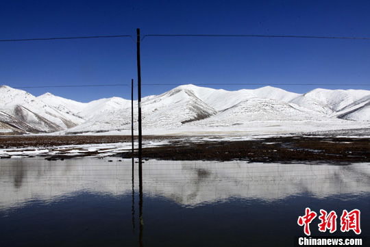 4月12日,青海省果洛藏族自治州,州府所在地玛沁县雪后天晴,积雪未融的山岭与路边积水倒影相映成趣,形成一幅天然雪域高原的美丽画卷。中新社发 孙自法 摄