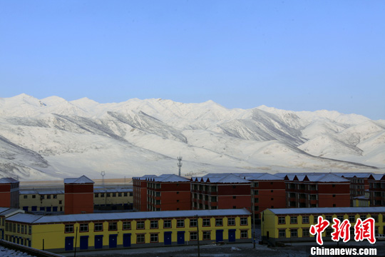 4月12日,青海省果洛藏族自治州,州府所在地玛沁县雪后天晴,积雪未融的山岭与城镇建筑相辉映,宛若美丽画卷。中新社发 孙自法 摄