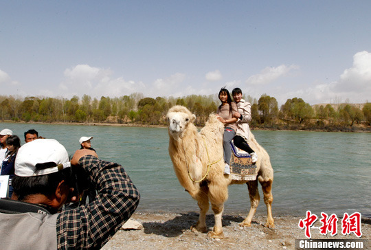 4月12日上午,两名女子坐着骆驼在黄河岸边留影。中新社发 胡友军 摄