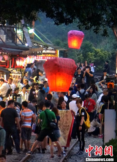4月12日,旅客在台湾新北市的平溪十分寮点燃盏盏天灯,一边旅游一边祈福。中新社发 李志全 摄