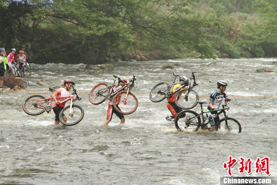 井冈山山地自行车挑战赛开赛 选手扛车涉水过赛道
