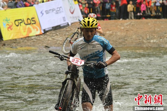井冈山山地自行车挑战赛开赛 选手扛车涉水过赛道(2)