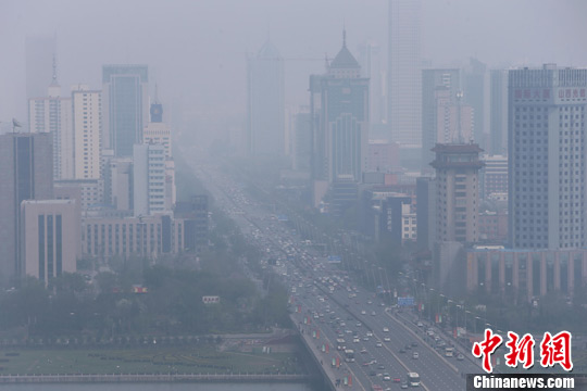 4月13日,山西太原被雾霾笼罩,pm2.5指数一度达到286,空气质量达到重度污染。中新社发 张云 摄