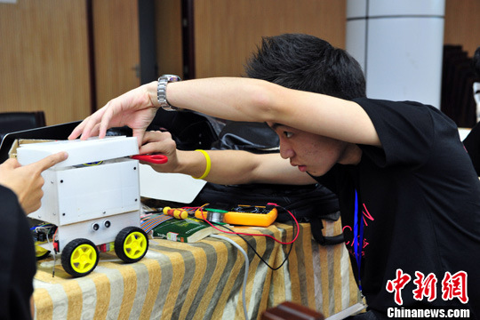 4月27日,广州大学代表队正在完善自己的作品—智能垃圾桶。当日,为时48小时的首届广州创客马拉松比赛在广州落幕,100多位90后年青人不眠不休,用大脑和键盘创造出富有高科技含量的创意作品。中新社发 陈骥旻 摄