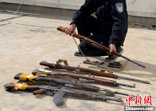 4月27日,专案组民警正在清点缴获的枪支和子弹。中新社发 钟欣 摄