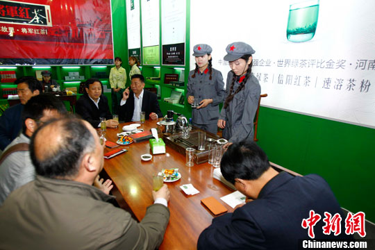 4月28日,河南信阳,来自大别山革命老区的姑娘们打扮成红军模样,为客商奉上新茶毛尖。当日,2014信阳第22届国际茶文化节在信阳市百花会展中心开幕。