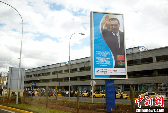 5月12日上午,中国国务院总理李克强在圆满结束对埃塞俄比亚和非盟总部、尼日利亚、安哥拉、肯尼亚的正式访问,并出席在尼日利亚举行的第24届世界经济论坛非洲峰会全会后,乘专机回到北京。这是当地主要街道悬挂欢迎李克强总理访问肯尼亚的巨幅照片。中新社发 刘震 摄