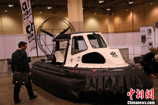 包罗了加拿大各领域创新成果的年度加拿大创新成果大会——“发现”,当地时间5月12日在多伦多揭幕。该活动汇集了加拿大各种科技创新成果,涵盖了火箭技术、3D扫描和打印、新医药科技等多个方面。图为展出的新型气垫船。中新社发 徐长安 摄