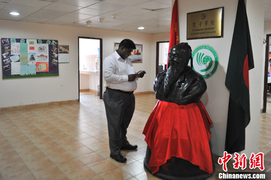 5月12日,孟加拉国达卡,南北大学孔子学院一孟加拉人在参观孔子塑像。孔子学院由中国云南大学和孟加拉国最好的私立大学南北大学在2006年共同创办,旨在推广汉语言教学工作。目前,孔子学院已在孟有9个分院共2600多名学生在这里学习汉语与汉文化。中新社发 任东 摄