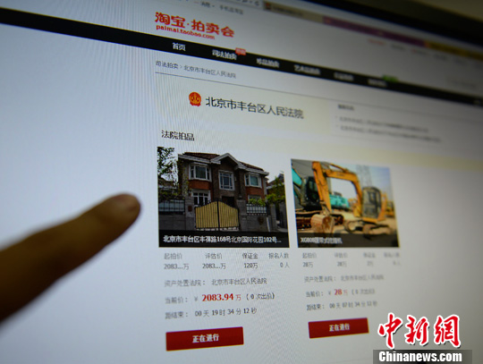 5月13日,北京市第二中级人民法院和北京市丰台区人民法院通过淘宝拍卖平台,公开拍卖三处涉诉房产,这是北京法院首次通过网络拍卖涉诉不动产。图为丰台区人民法院在网上拍卖的房产。中新社发 侯宇 摄