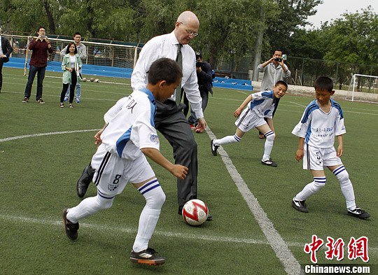 5月13日,瑞典驻华大使罗睿德与来自中国西部地区的希望小学学生一起踢足球。中新社发 苏丹 摄