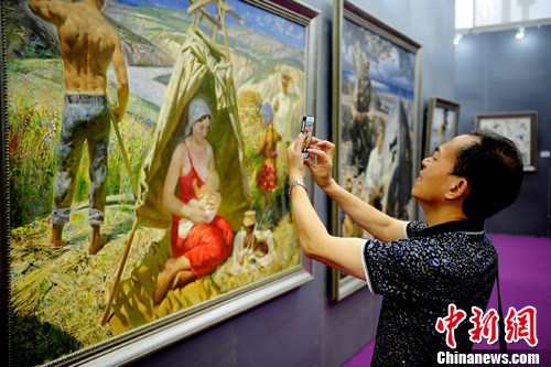 5月16日,来自俄罗斯、朝鲜、法国等艺术家的油画作品在深圳文博会上展出或拍卖,众多优秀作品吸引参观者驻足欣赏。图为俄罗斯油画作品。中新社发 陈文 摄