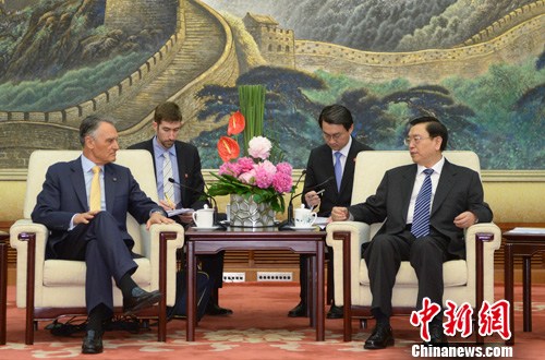 5月16日,中国全国人大常委会委员长张德江在北京人民大会堂会见了葡萄牙总统席尔瓦。中新社发 廖攀 摄