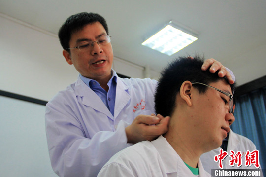 湖南中医药大学针灸推拿学院院长李铁浪为毕业生讲解推拿手法。唐小晴 摄