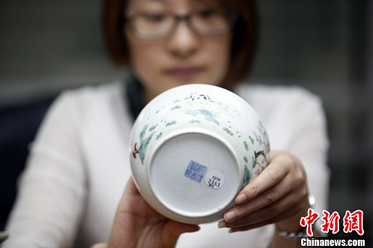 图为媒体查看重要拍品“清道光 粉彩三羊开泰图墩式碗”。中新社发 杨可佳 摄