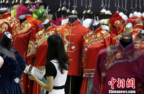 图为中式婚礼礼服吸引参观者。中新社发 汤彦俊 摄