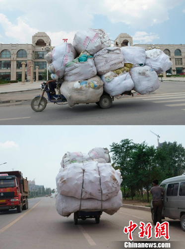 7月3日,内蒙古呼和浩特街头,一满载货物的三轮车缓慢行驶在路上,堆积的货物挡住了驾驶员的侧身。图为超载三轮车的侧面和后面。(拼版图片)中新社发 刘文华 摄