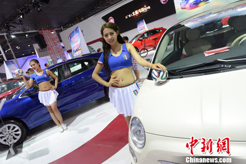 7月3日,一品牌展区内,车模身着意大利性感队服,手拿足球为品牌造势。中新社发 刘文华 摄