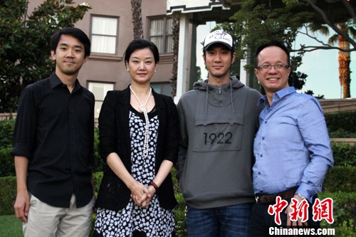 当地时间7月2日,即将于5日在好莱坞碗“中华之夜”专场音乐会上献艺的著名音乐艺术家宋祖英(左二)、王力宏(左三)、陈瑞斌(左四)和苏柏轩(左一)齐聚洛杉矶。他们表示,对此次融民族、流行及古典音乐为一炉的艺术盛会十分期待,并盼望大家的首次合作能碰撞出新的艺术火花。这是著名的好莱坞碗首次举办中国专场音乐会。中新社发 邱晨 摄