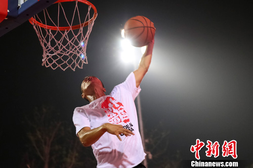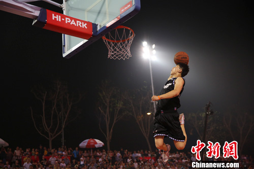 7月6日,北京篮球嘉年华上选手正在进行扣篮比赛。中新社发 熊然 摄