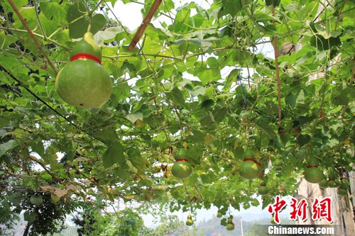 8月21日,在湖北远安县花林寺镇三孔村三组,村民陈友斌种的葫芦引来不少路人的目光。不久前,陈友斌家的一个葫芦架上一下子结出了60多个可爱的葫芦,成为了当地一景。陈友斌表示,本来这些葫芦是准备种了吃的,但是因为这次的比较特别,所以会留着做成纪念品。据了解,葫芦是中华民族最原始的吉祥物之一,每个成熟的葫芦里葫芦籽众多,寓意“子孙万代,繁茂吉祥”,葫芦又谐音“福禄”,加之其本身形态各异,造型优美,因此千百年来葫芦一直被当作吉祥物和观赏品。(完)