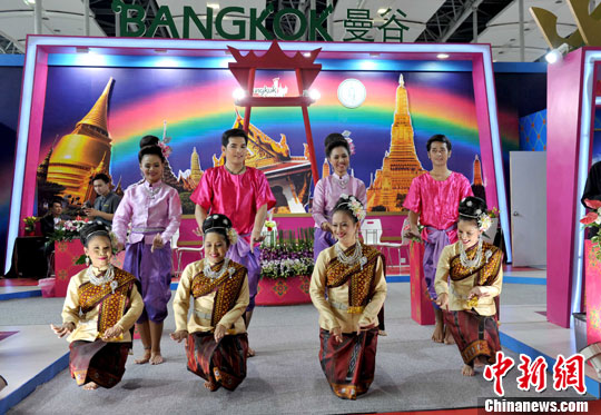 图为泰国曼谷展台上演极具民族特色的舞蹈。中新社发 刘卫勇 摄