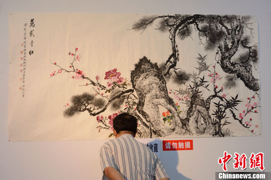 图为爱新觉罗·毓崧、毓敏等家族7人合作所绘作品《万紫千红》。中新社发 刘文华 摄