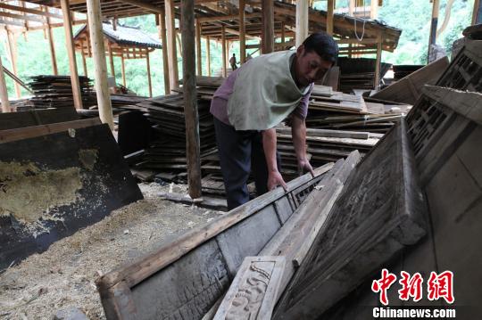 8月28日,在湖北宜昌点军区正在建设的车溪民俗风情街,51岁的工人谭维虎在认真检查从民间收集来的雕花木构件。据了解,该民俗风情街由27栋充满土家风情的吊脚楼组成,建筑面积达7000平方米,采用全木质、古法工艺建造,整个建筑未使用一颗铁钉。建成后的民俗风情街将成为宜昌非物质文化遗产展示基地,集中展示“九佬十八匠”等濒临失传的工艺。点军因三国大将关羽在此点视兵马而得名,是历史上“上控巴夔,下制荆襄”之要塞,有“三峡门户”、“川鄂咽喉”。