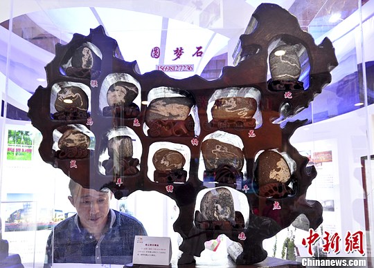 8月28日,参观者欣赏”十二生肖”泰山奇石。当日,在济南举行的第五届山东文化创意产业博览交易会上,一尊由12块酷似“十二生肖”的泰山石安置在中国地形轮廓框架中组成的“圆梦石”,吸引许多参观者驻足观赏。中新社发 张勇 摄