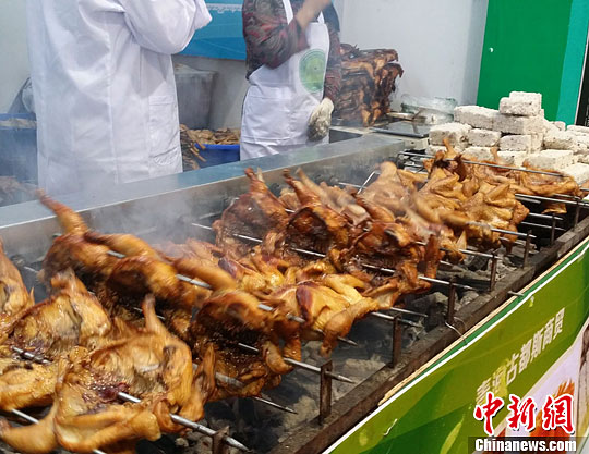 图为青海厨师现场制作的烤鸡。殷春永 摄