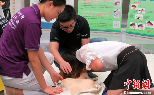 日常生活中,遇到意外创伤、窒息、晕倒、猝死等伤病,该如何在最短的时间内用正确的方法对患者进行处理呢?10日,在“白金十分钟——全国自救互助活动日”上,第三军医大学西南医院急诊部的医护人员向市民及病患现场演示了心肺复苏术、解除成人气道异物和儿童气道梗阻救治的方法。