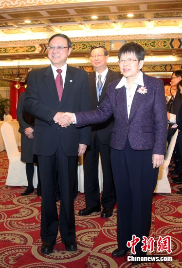 图为经合会大陆方面召集人、海协会常务副会长郑立中(左)与经合会台湾方面召集人、海基会副董事长施惠芬(右)握手致意。 中新社发 路梅 摄