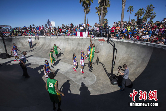 当地时间2月12日,在美国洛杉矶,以花式篮球表演闻名全球的哈林环球旅行者篮球队(Harlem Globetrotters)再创历史,首次在威尼斯海滩滑板公园"大碗"内举行表演。中新社发 林戈 摄