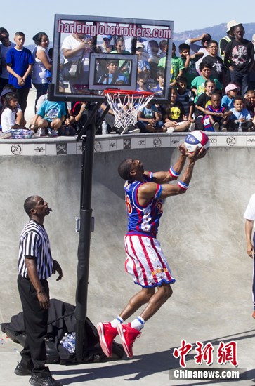 当地时间2月12日,在美国洛杉矶,以花式篮球表演闻名全球的哈林环球旅行者篮球队(Harlem Globetrotters)再创历史,首次在威尼斯海滩滑板公园"大碗"内举行表演。 中新社发 林戈 摄