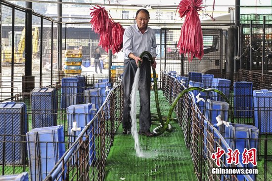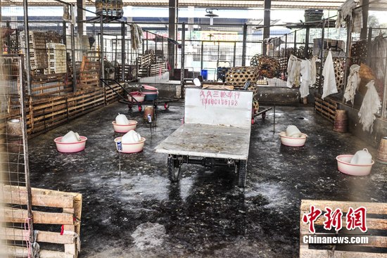 2月13日,广州江村家禽批发市场一商户清洗场地。 中新社发 陈骥旻 摄
