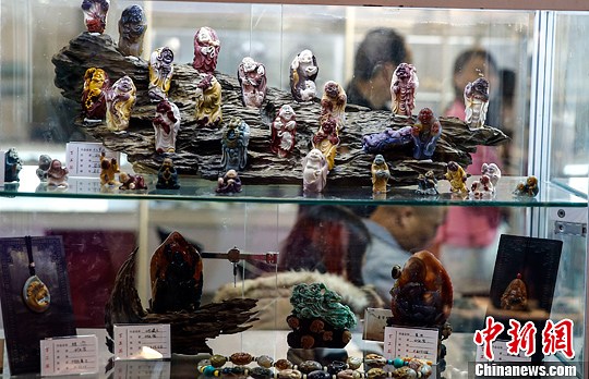 4月10日,2015中国国际珠宝首饰展览会在北京中国国际展览中心开幕,图为“十八罗汉”玉雕亮相。中新社发 张浩 摄