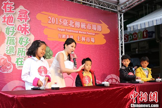 4月11日,台北市市场处主办的“2015台北传统市场节”进入士林市场开展系列活动,小学生参加“市场小学堂闯关问答”环节。活动旨在呼吁民众走入传统市场,感受在地的人情味和美味。中新社发 陈小愿 摄
