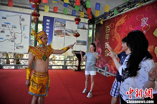 5月25日,参加第十届世界华裔杰出青华夏行·重走南侨机工之路活动的青年代表,正在向傣族老师学习孔雀舞。中新社发 刘冉阳 摄