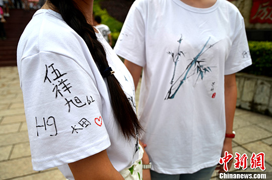 学生们在自制服装上签名留念。张骥 摄