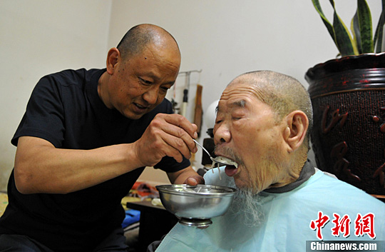 6月4日,位于河北石家庄一户普通家庭,52岁的路国安正细心地喂养父吃饭。中新社发 翟羽佳 摄