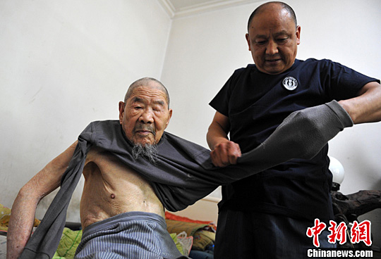6月4日,位于河北石家庄一户普通家庭,52岁的路国安为养父穿衣。中新社发 翟羽佳 摄