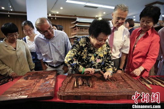 图为中国紫檀博物馆馆长陈丽华(中)现场展示“紫檀雕刻”这一国家级非物质文化遗产。中新社发 赵隽 摄