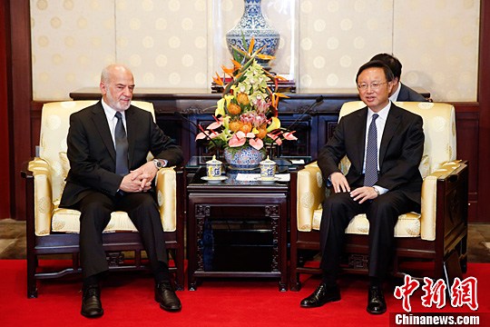 6月16日,中国国务委员杨洁篪在北京钓鱼台国宾馆会见伊拉克共和国外交部长易卜拉欣·贾法里。中新社发 盛佳鹏 摄