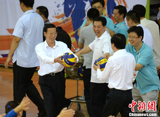 6月29日,中央国家机关第四届职工运动会在北京开幕。中共中央政治局常委、国务院副总理张高丽(左)出席开幕式。中新社发 侯宇 摄